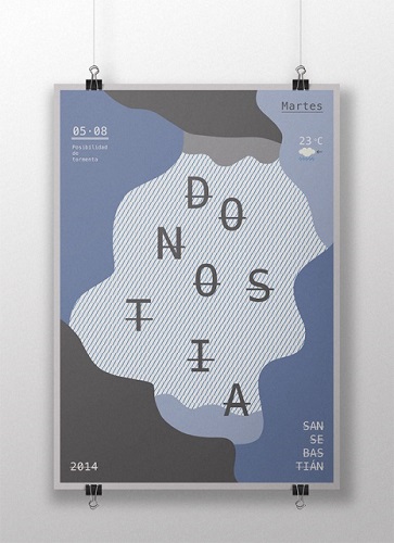 «Me gusta más intentar trasladar las sensaciones de lo que pueda trasmitir el tiempo en Donostia que lo meramente descriptivo. La idea del cartel es tratar de describir esa sensación tan rara de cuando hace calor (a mi también me tocó mucha humedad en la previsión del lunes) y no paras de sudar, vamos que es un rollo. Bajo la frase de «por qué hace calor si no hace sol» aparece el típico sol de esos días bajo las nubes que a su vez hace de carita sudorosa».