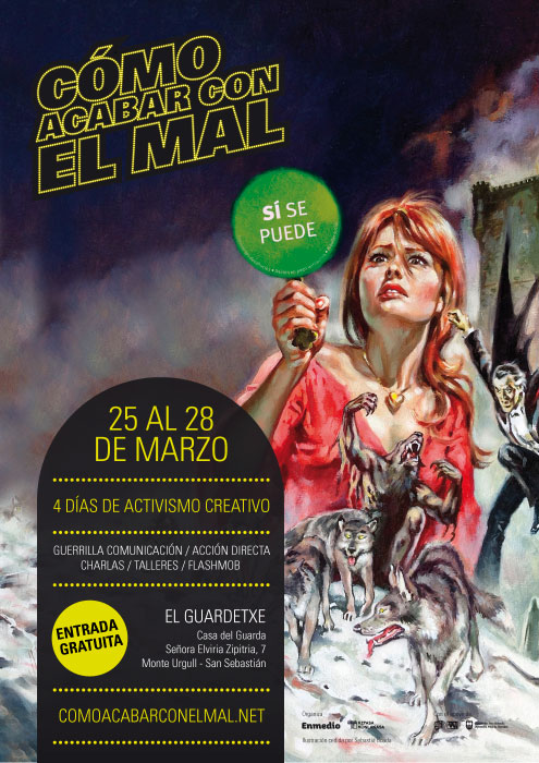 El colectivo Enmedio de Barcelona y Kepaskonlakasa (ahora Stop Deshaucios Gipuzkoa) tienen claramente identificados a los actores que encarnan el mal: los bancos y las empresas multinacionales, las privatizadores de los servicios públicos, aquellos que recortan nuestros derechos y libertades (Ley Mordaza), el neoliberalismo… En realidad, no parece que haya nada nuevo bajo el sol del «enemigo capitalista». Sin embargo, lo que les diferencia a los organizadores de «Cómo acabar con el mal» -cuatro días repletos de presentaciones y talleres dedicados a pensar nuevas maneras de actuar en este contexto de crisis generalizada- son sus armas. Lo llaman activismo creativo. Tendrá lugar entre el 25 y el 28 de marzo en el Guardetxe de Urgull. Y el encuentro promete de verdad, porque el listón está muy alto.