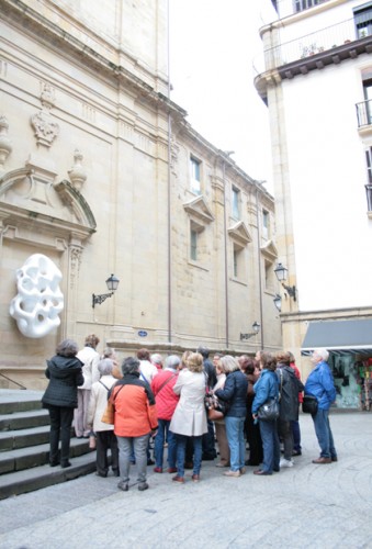 Viernes 17 de abril, 19 horas. Recorremos la calle de arriba a abajo redescubriendo todos sus encantos, sobre todo gastronómicos. También alguna que otra cuestión al margen, como la extraña figura ‘LA ARMONÍA DEL SONIDO’ del artista irlandés Maximilian Pelzmann en un lateral de la fachada de la Basílica de Santa María del Coro. Un grupo de turistas se arremolina enfrente de la Iglesia y tienen a sus espaldas el bar ATARI, que ha introducido con éxito el concepto de gastroteca en la ciudad. Como casi siempre, la terraza está llena y dentro también hay mucho ambiente. Triunfan sus famosos gintonic premium y pintxos elaborados. Los dos últimos en llegar han sido el magret con puré de piña y manzanas y la vieira a la plancha con puré de berenjena. Suena delicioso.