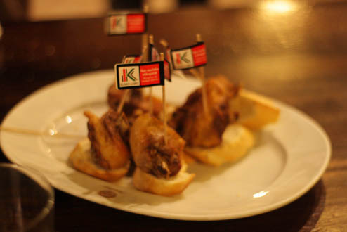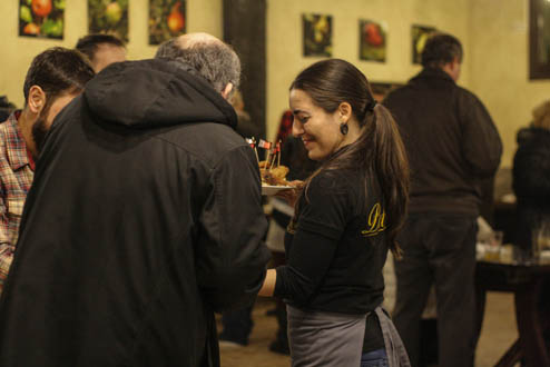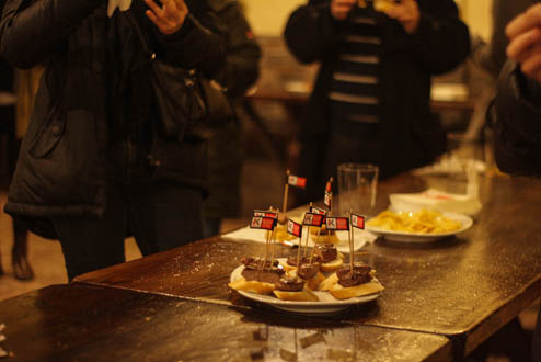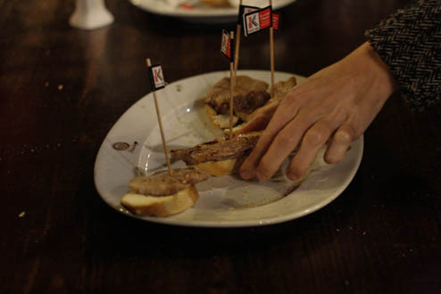 Antes de que Los Bracco salten a escena, los camareros se afanan en surtir de pintxos a todo el mundo. El comedor ya está lleno. El pintxo más demandado, curiosamente, no es ninguno de carne: la tortilla de patatas vuela.