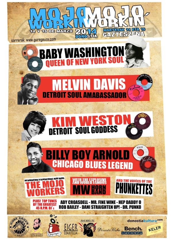 Los próximos días 14 y 15 de marzo se celebrará la 5ª edición en Gasteszena a partir de las 21 horas. Y han tirado la casa por la ventana. También han sufrido varios imprevistos de última hora: el pasado 24 de enero anunciaban en su cuenta de Facebook la baja de Gino Washington, que iba a ser sustituido por Sugar Pie Desanto, la diva en quien se debió inspirar Amy Winehouse para armar su look vintage. «El señor George Washington no ha actuado de manera sincera ni profesional con nosotros. Nos ha hecho perder 1600 euros de los billetes de avión y está por ver si nos devuelve la fianza. El haber firmado y haberse comprometido con sus fans no parece ser suficiente para hacerle superar sus múltiples miedos». Sin embargo, en una insólito cambio de planes, la propia sustituta ¡también es baja! En su caso parece que por enfermedad. Le sustituye Melvin Davis, que tras el éxito cosechado el año pasado repite en el cartel. Davis, además, es el ojito derecho de la organización y su vibrante single soul, «Chains of love», estará a la venta.