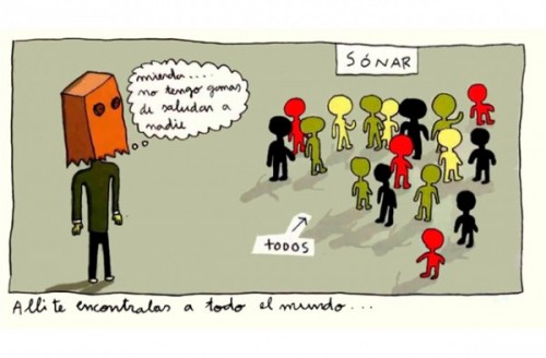 En los festivales es prácticamente imposible que no suceda algo así. Muchos asistentes reconocen que no tienen la más mínima idea de qué grupos componen el cartel. Puede que no vean un sólo concierto. Como en una ocasión acertó a dibujar Juanjo Saez, los festivales se han convertido en un reunión de carácter social muy similar a la misa de domingo de nuestros abuelos. Lo de menos es el sermón del cura. ¿De verdad vamos a gastar nuestras energías prestando atención a la homilía? A lo que hemos venido es dejarnos ver, saludar, comentar la jugada, cuchichear… Visto así, un concierto puede llegar a ser el marco idóneo para una conversación de cualquier tipo.