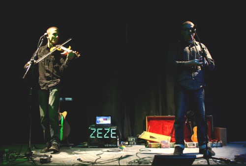 No suelen ser muy habituales este tipo de aperitivos electrónicos en el salón de actos del Koldo Mitxelena. Iparraldea Bertan 2015 es un ciclo más bien de carácter tradicional que sirve para estrechar lazos culturales y musicales entre ambos lados de la muga. Así que la de ayer fue la propuesta más «moderna» del lote. De todas formas, para ser honestos, el dúo Zeze.Miege no basa su fuerza en el ideario electrónico; lo suyo es un viaje por el mundo de la mano del cajón de sastre de la, por algunos, denostada world music. Repostan en los lugares más recónditos del planeta (África, India) y otros que nos pillan más cerca (Galicia, Sara) para rascar en sus tradiciones musicales. Se dedican a rescatar sonidos ancestrales mezclándolo con la vanguardia de la música electrónica. «Musical battle » lo llaman estos dos músicos de Biarritz. Y algo de eso hay: la batalla entre pasado y presente-futuro es de los que no dejan a nadie indiferente.