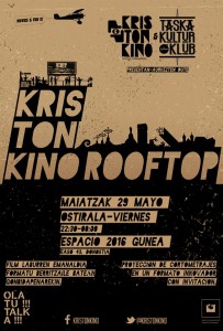 Javier Maldonado (Maldo), uno de los cuatro miembros del colectivo Kristonkino, está ultimando los detalles de Rooftop. Respira aliviado. Parece que ya está todo atado y que el evento audiovisual que tendrá lugar este viernes 29 a las 22:30 horas va a poder celebrarse con los típicos ingredientes con los que sazonan sus propuestas este grupo de inquietos actores y directores. Será la continuación del Vermukino -aquel exitoso cóctel de cine, música y gastronomía que revolucionó la sala Andia de la Kutxa a finales del año pasado- y ya se ha posicionado como una de las perlitas del próximo festival Olatu Talka. El plan es realmente apetecible: no todos los días se puede ver una muestra de cortometrajes en petite comité –el acceso está limitado a 60 personas- en una azotea, concretamente en la de la sede de Donostia 2016 (calle Easo, 45).