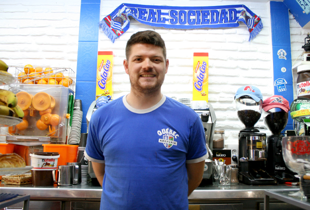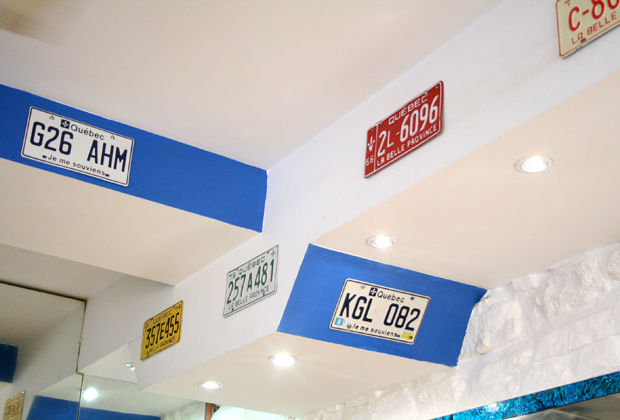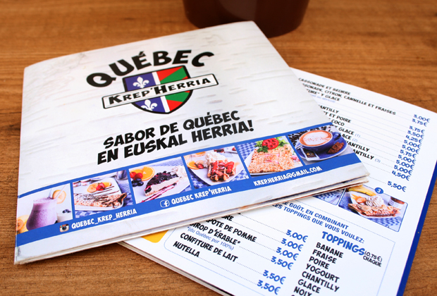 Para empezar, he puesto Québec en grande en la entrada y en el logo mezclándolo con la ikurriña. Además, así también tengo visitas de paisanos míos que son muchos más de los que pensaba y hablo francés con ellos. Al principio tuve muchos problemas porque parece que suena a Kebab. La gente decía, «mira, han abierto otro Kebab». Y no. Luego si levantas un poco la cabeza puedes ver cosas típicas de mi país: las matrículas de los coches, raquetas de nieve, el hockey, beisbol, el sirope de arce, que es un producto muy nuestro, en las cartas también meto algún guiño sobre Quebec, yo (risas)…